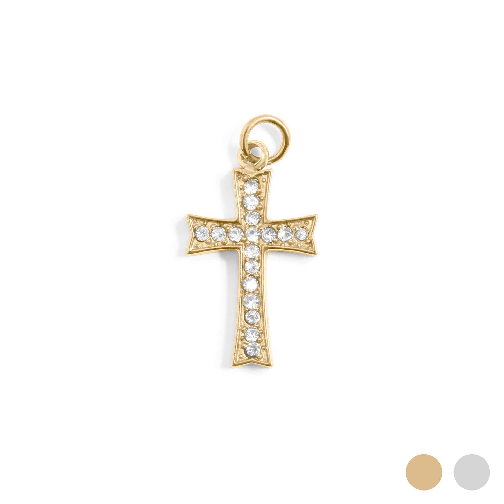 This elegant charm combines timeless symbolism with modern craftsmanship. Made from durable stainless steel and enhanced with a rich 18K gold PVD finish, it features a beautifully detailed cross adorned with a sparkling stone centerpiece. Perfect for adding a meaningful accent to bracelets, necklaces, or charm collections, this piece is both stylish and durable for everyday wear.